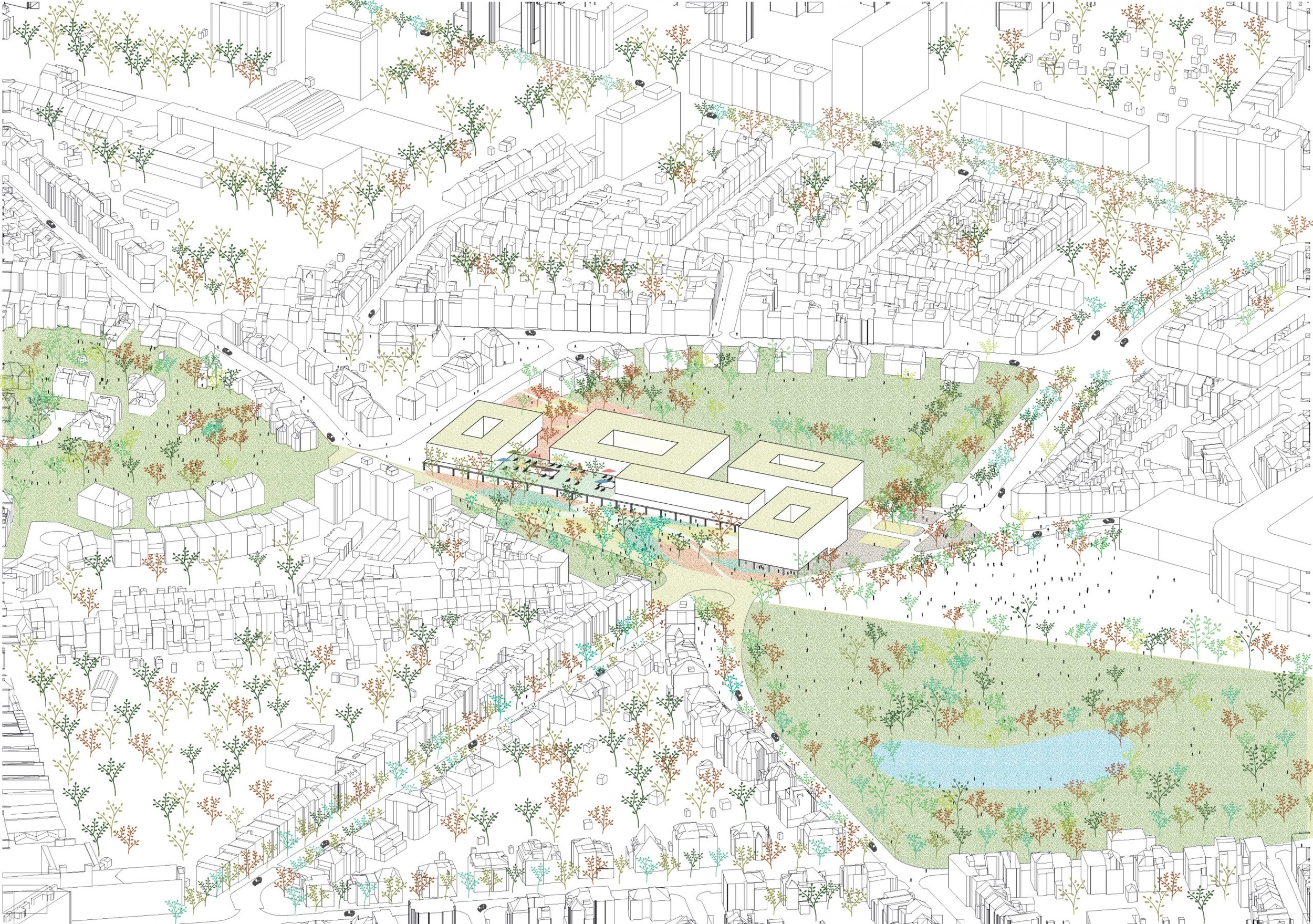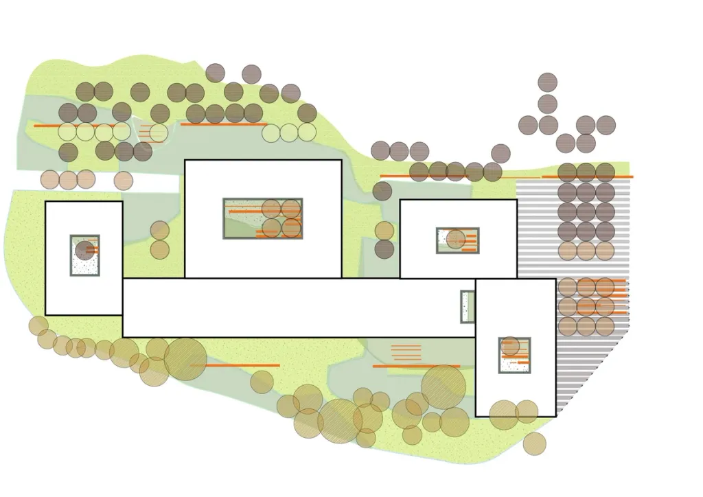 The hospital is firmly rooted in the city while remaining surrounded by valuable green spaces. To preserve these, the existing building is densified and restructured instead of adding new infrastructure. A new public park links the hospital with the neighbourhood. The masterplan echoes the urban planning logic of the surrounding garden cities, with the same emphasis on greenery and quality of life. The proximity of green space reflects an approach in which the health and well-being of patients and staff are central.