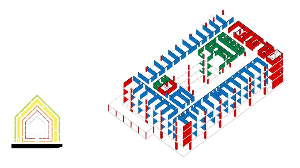 The forward-looking and reversible nature of the new outpatient clinic stems from thorough analyses of structural, technical and spatial aspects. Spaces have been designed so they can be easily adapted to new functions. We place strong emphasis on optimising material and energy flows, the core principle of the circular economy. This is reflected in the choice of materials, the design of the building envelope and the application of energy guidelines.
