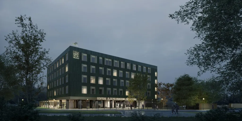 The Joseph Bracops Hospital – part of the Iris South Hospitals network in Brussels – is located in the heart of Anderlecht, within walking distance of the football stadium. The project is based on an ambitious masterplan that focuses on urban densification of the campus and the creation of a new public park for local residents. The entire project follows the principles of the circular economy: local and sustainable materials, reversible design, the zero‑energy principle and a carefully considered assembly-based construction. The result is a hospital that strengthens both its urban context and the public indoor and outdoor spaces in a sustainable way.