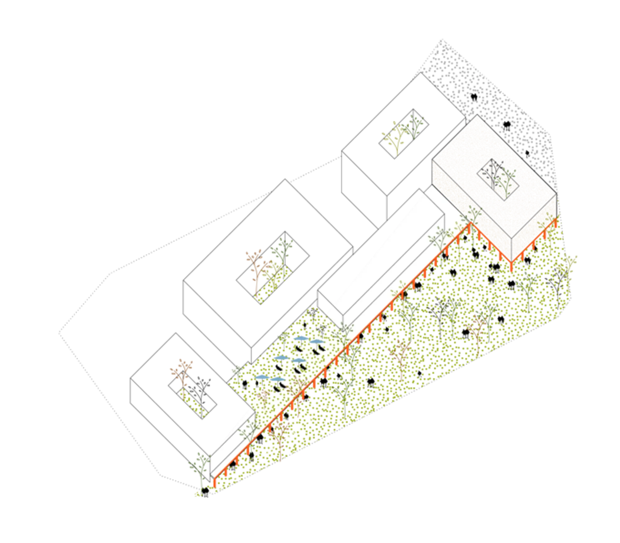 Green spaces run beneath the outpatient clinic, linking the paved square with the park and converging at the main entrance, where a patio floods the reception with natural light and brings greenery indoors. In the lobby, a cafeteria with park views strengthens the hospital’s social bond with the neighbourhood. The urban location is treated as an opportunity to assume a broader social role: the hospital becomes a natural part of the city rather than a place to avoid, “de‑sacralising” access to care and easing the transition into medical spaces.