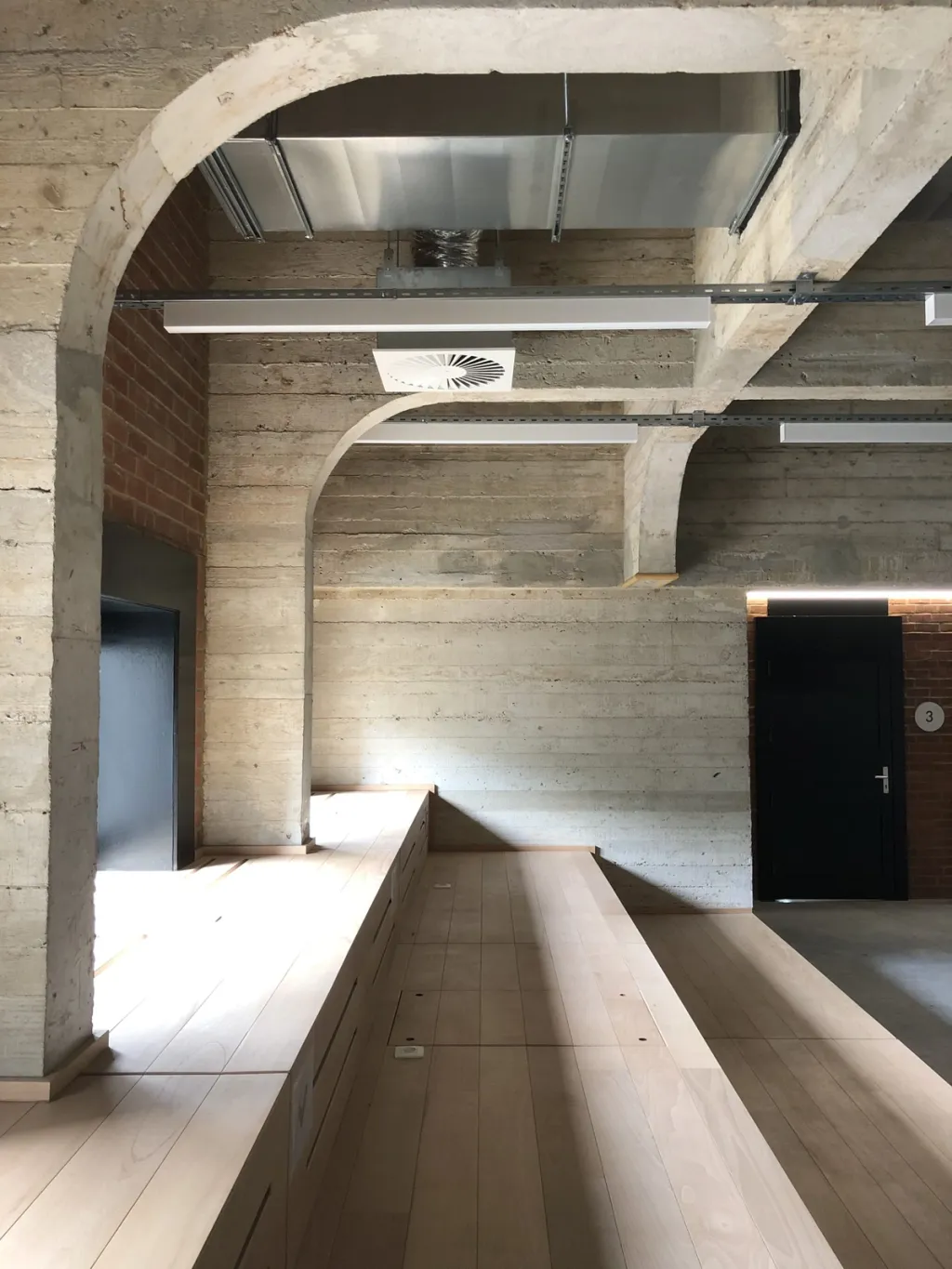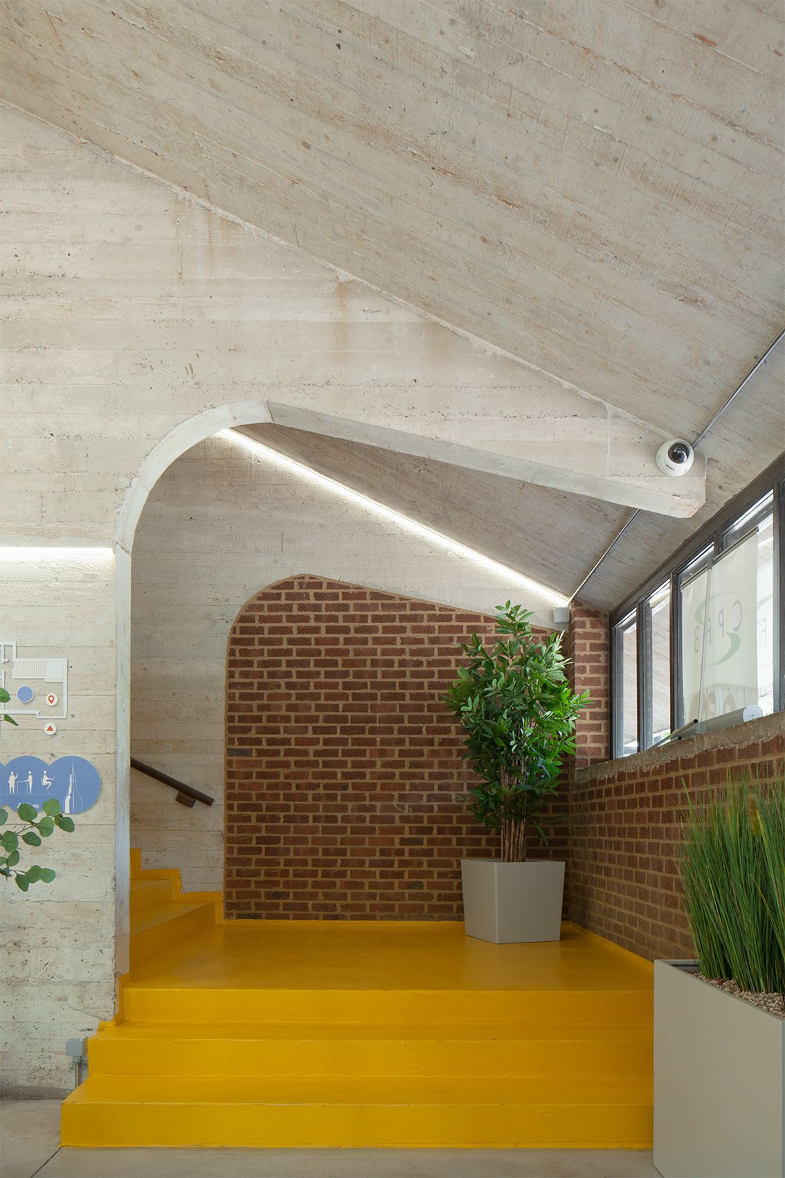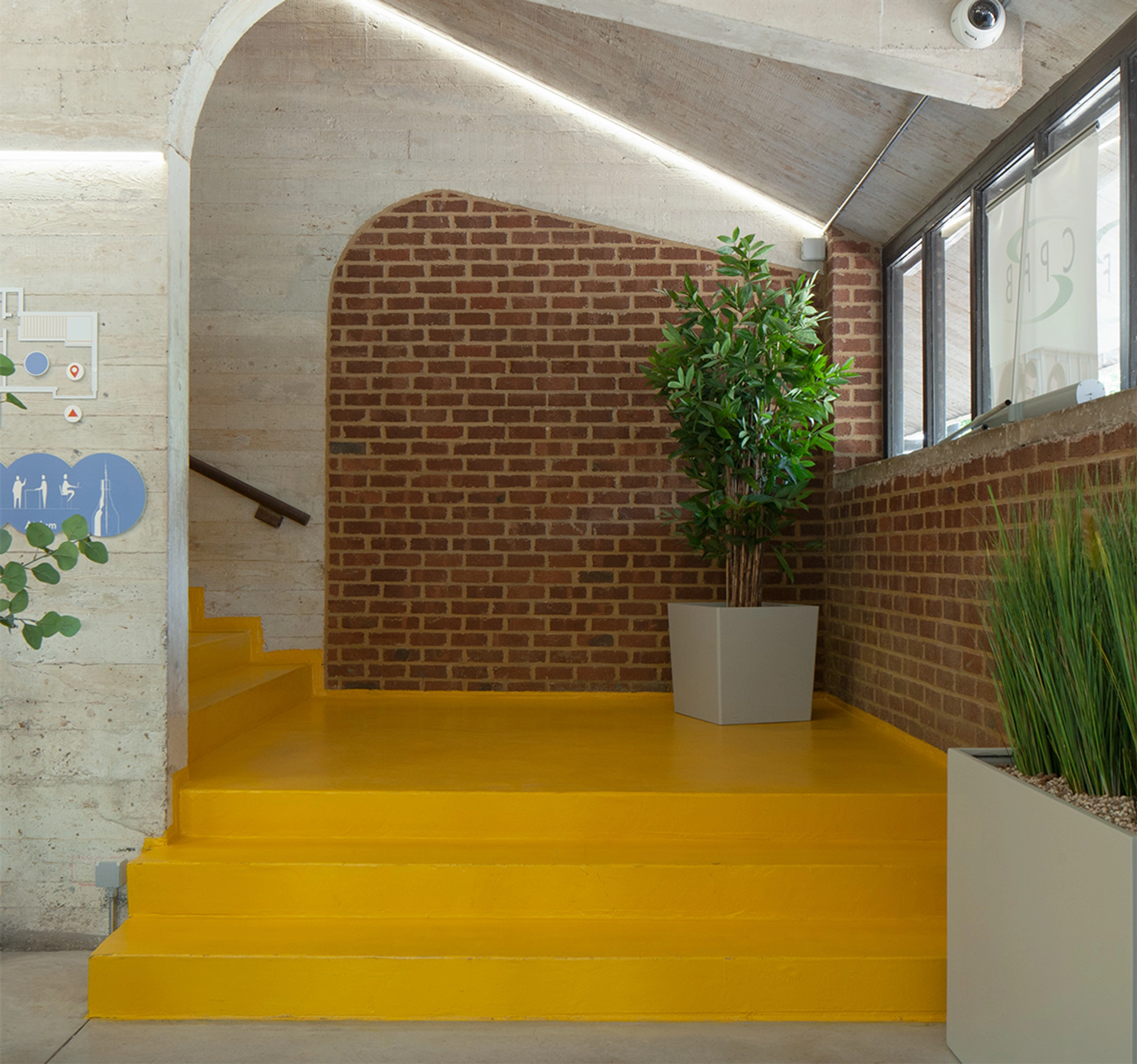 Once the materiality and volume had beenrestored , a smooth concrete screed floor was poured to emphasise the robust character. Graphic accents reinforce this: lighter new joinery contrasts with the darker existing elements, and the yellow staircase stands out against the red brickwork. These contrasts highlight the inherent qualities and bring the building back to life.