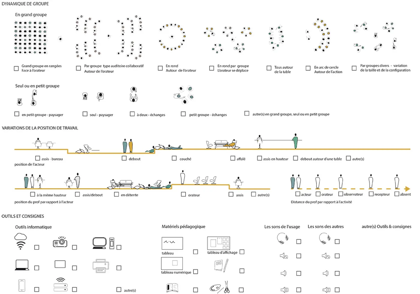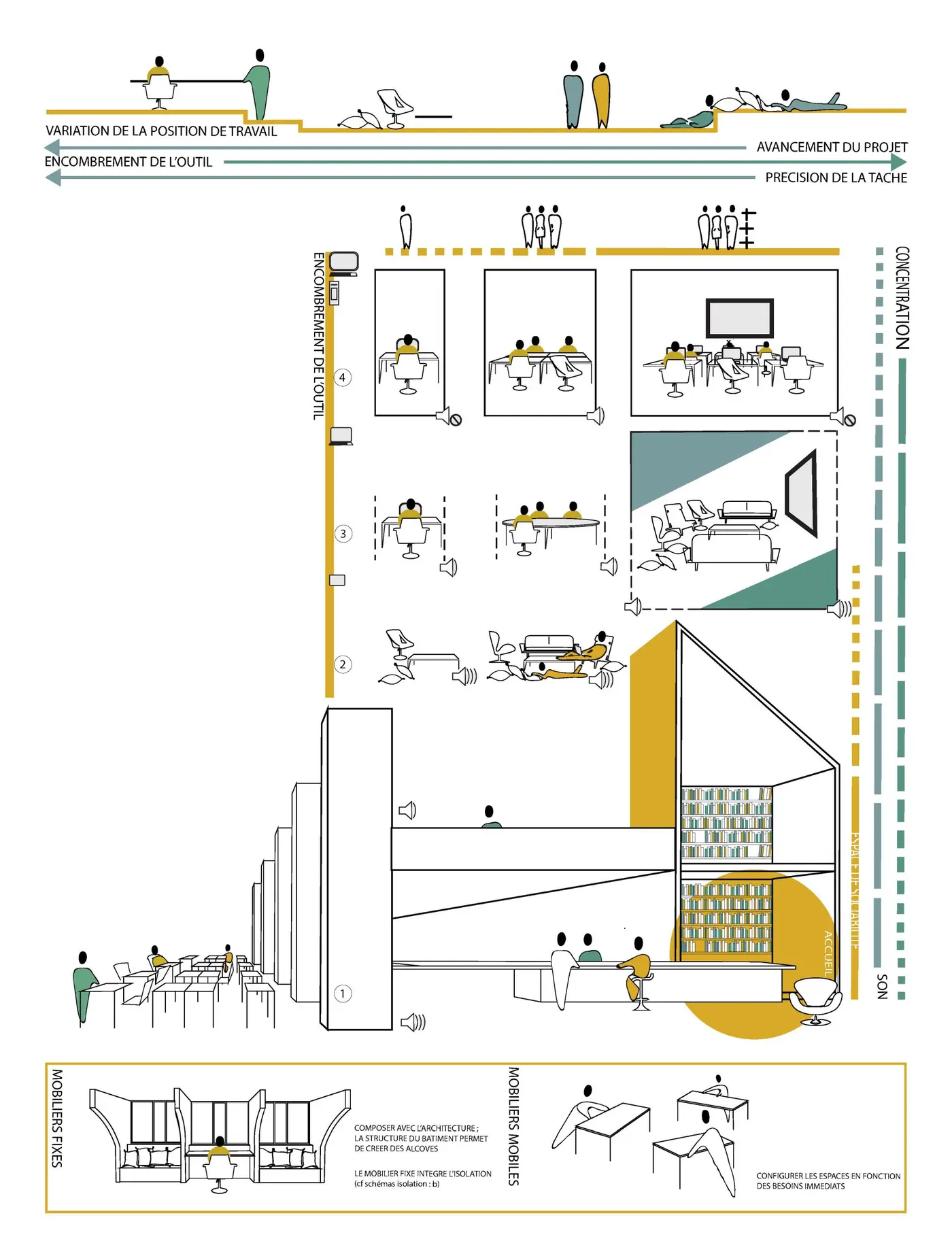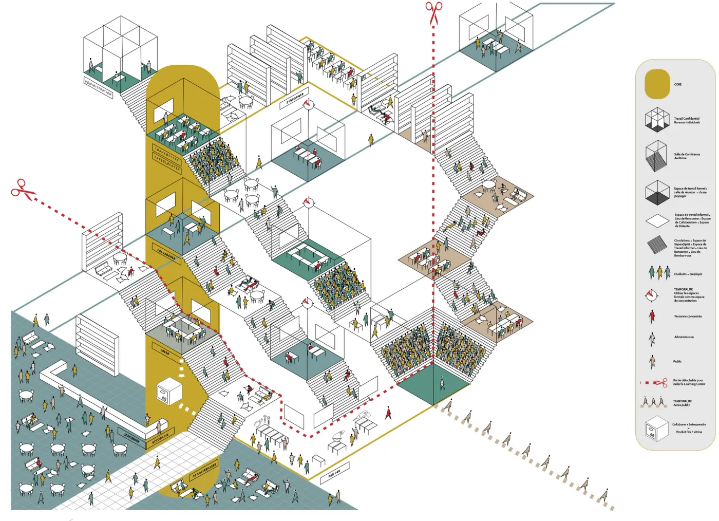 Visualisation of the different zones in the building – ergonomics, social interactions, acoustics.